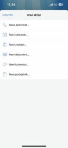iOS sustav nam nudi samo sljedeću opciju: u aplikaciji Intrix možete kliknuti na ikonu “poziv” na kontaktu, zatim prekinuti poziv, vratiti se u aplikaciju Intrix i tada se nudi opcija snimanja poziva. Imamo mogućnost povezati ovaj poziv s brzim akcijama u Intrixu i tako dodati novi upit, ponudu, poziv, sastanak, reklamaciju, dokument ili komentar.